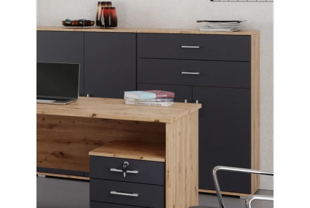 Sada dverí a zásuviek (4 ks) z kancelárskeho programu Lift – v antracitovej farbe. Dvere a zásuvky sú určené na montáž k regálu z programu Lift. Vytvoríte si tak v regáli ľahko vnútorný úložný priestor.