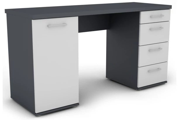Priestranný písací stôl s pevnou konštrukciou má ľavé dvere s úložným priestorom a rad zásuviek, kam prehľadne uložíte všetko potrebné. Vyrobený v kombinácii grafitovo šedej a bielej farby.