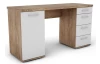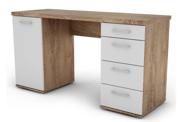 Priestranný písací stôl s pevnou konštrukciou má ľavé dvere s úložným priestorom a rad zásuviek, kam prehľadne uložíte všetko potrebné. Vyrobený v kombinácii dekoru dub burgund a bielej farby.