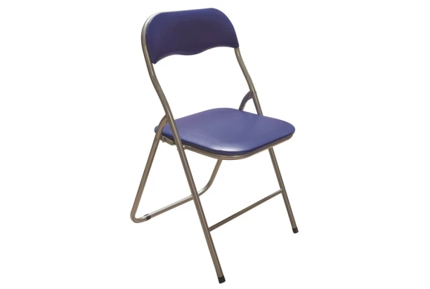 Praktická stolička so skladacou kovovou konštrukciou a sedadlom potiahnutým modrou ekokožou. Ľahko zložíte a uložíte v prípade potreby.