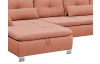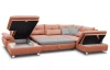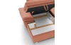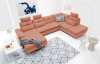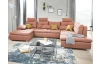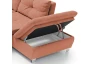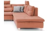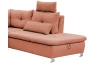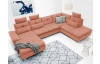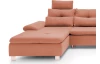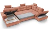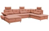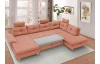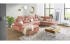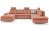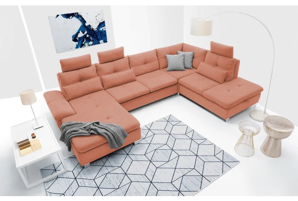 Priestranná trendová sedacia súprava s pôdorysom v tvare pravé U, obsahuje funkciu rozkladu na lôžko, dva rôzne úložné priestory, polohovateľnú podrúčku, vankúše aj tri opierky hlavy, ktoré môžete ľubovoľne umiestniť na akúkoľvek časť sedačky. Očalúnená príjemne mäkkou látkou v odtieni lososová.