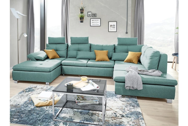 Priestranná trendová sedacia súprava s pôdorysom v tvare pravé U obsahuje funkciu rozkladu na lôžko, dva rôzne úložné priestory, polohovateľnú podrúčku, vankúše aj tri opierky hlavy, ktoré môžete ľubovoľne umiestniť na akúkoľvek časť sedačky. Očalúnená príjemne mäkkou látkou v odtieni mentolovo zelená.