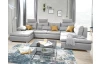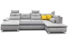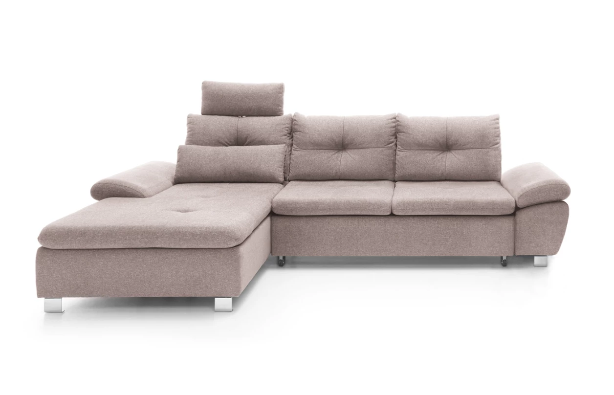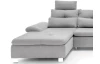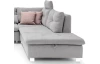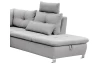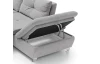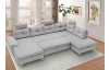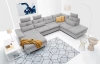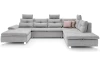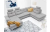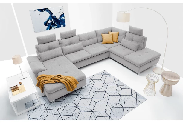 Priestranná trendová sedacia súprava s pôdorysom v tvare pravé U obsahuje funkciu rozkladu na lôžko, dva rôzne úložné priestory, polohovateľnú podrúčku, vankúše aj tri opierky hlavy, ktoré môžete ľubovoľne umiestniť na akúkoľvek časť sedačky. Očalúnená príjemne mäkkou látkou v odtieni svetlo šedá.