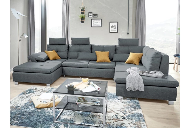 Priestranná trendová sedacia súprava s pôdorysom v tvare pravé U obsahuje funkciu rozkladu na lôžko, dva rôzne úložné priestory, polohovateľnú podrúčku, vankúše aj tri opierky hlavy, ktoré môžete ľubovoľne umiestniť na akúkoľvek časť sedačky. Očalúnená príjemne mäkkou látkou v odtieni dymovo šedá.