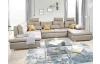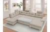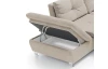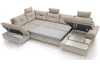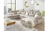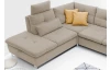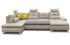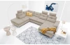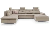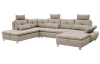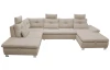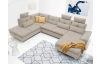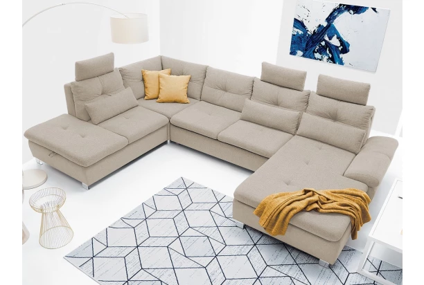Priestranná trendová sedacia súprava s pôdorysom v tvare ľavé U, obsahuje funkciu rozkladu na lôžko, dva rôzne úložné priestory, polohovateľnú podrúčku, vankúše aj tri opierky hlavy, ktoré môžete ľubovoľne umiestniť na akúkoľvek časť sedačky. Očalúnená príjemne mäkkou látkou v odtieni svetlo béžová.