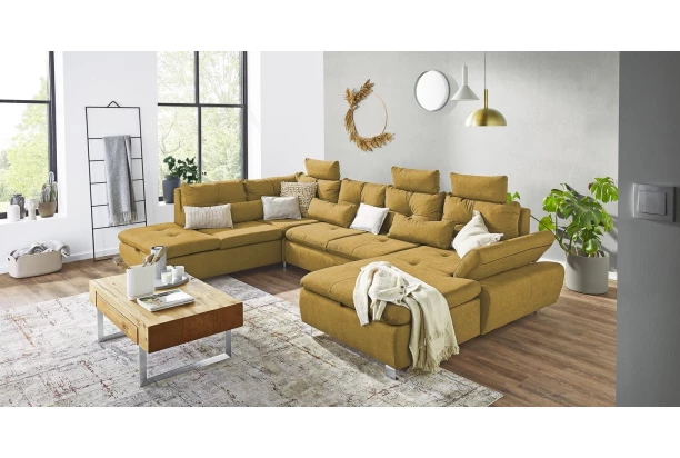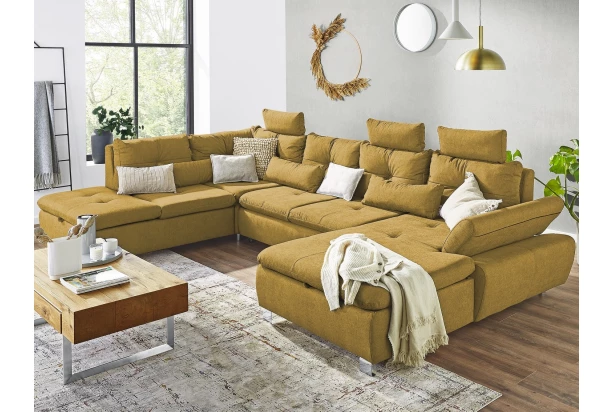 Priestranná trendová sedacia súprava s pôdorysom v tvare ľavé U obsahuje funkciu rozkladu na lôžko, dva rôzne úložné priestory, polohovateľnú podrúčku, vankúše aj tri opierky hlavy, ktoré môžete ľubovoľne umiestniť na akúkoľvek časť sedačky. Očalúnená príjemne mäkkou látkou v odtieni horčicová žltá.