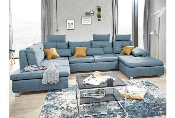 Priestranná trendová sedacia súprava s pôdorysom v tvare ľavej U obsahuje funkciu rozkladu na lôžko, dva rôzne úložné priestory, polohovateľnú podrúčku, vankúše aj tri opierky hlavy, ktoré môžete ľubovoľne umiestniť na akúkoľvek časť sedačky. Očalúnená príjemne mäkkou látkou v odtieni tyrkysová.