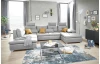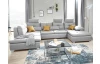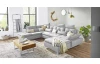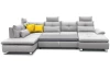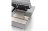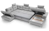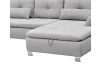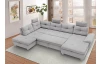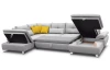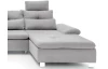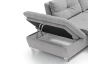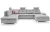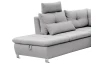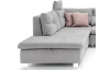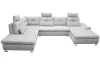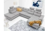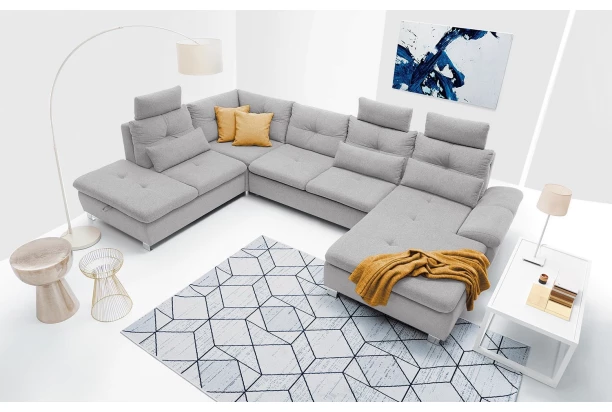 Priestranná trendová sedacia súprava s pôdorysom v tvare ľavé U obsahuje funkciu rozkladu na lôžko, dva rôzne úložné priestory, polohovateľnú podrúčku, vankúše aj tri opierky hlavy, ktoré môžete ľubovoľne umiestniť na akúkoľvek časť sedačky. Očalúnená príjemne mäkkou látkou v odtieni svetlo šedá.