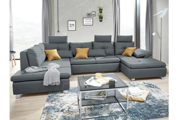 Priestranná trendová sedacia súprava s pôdorysom v tvare ľavé U obsahuje funkciu rozkladu na lôžko, dva rôzne úložné priestory, polohovateľnú podrúčku, vankúše aj tri opierky hlavy, ktoré môžete ľubovoľne umiestniť na akúkoľvek časť sedačky. Očalúnená príjemne mäkkou látkou v odtieni dymovo šedá.