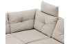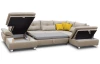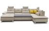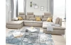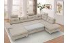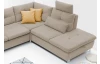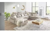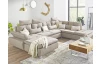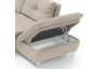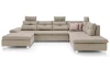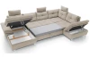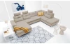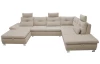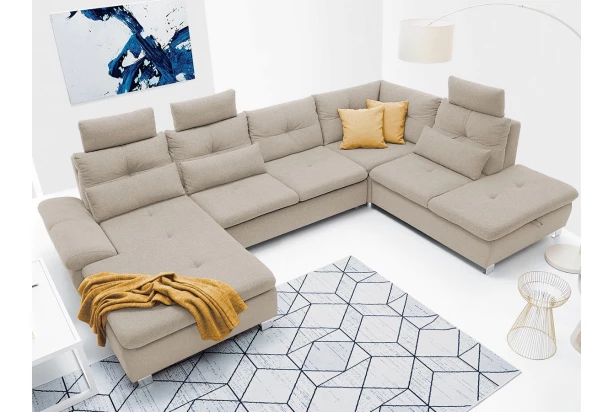 Priestranná trendová sedacia súprava s pôdorysom v tvare pravé U, obsahuje funkciu rozkladu na lôžko, dva rôzne úložné priestory, polohovateľnú podrúčku, vankúše aj tri opierky hlavy, ktoré môžete ľubovoľne umiestniť na akúkoľvek časť sedačky. Očalúnená príjemne mäkkou látkou v odtieni svetlo béžová.