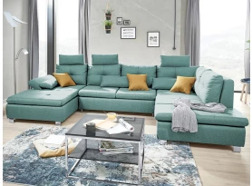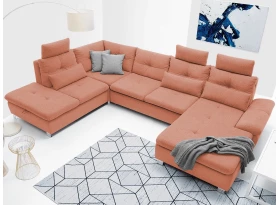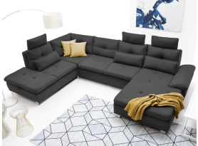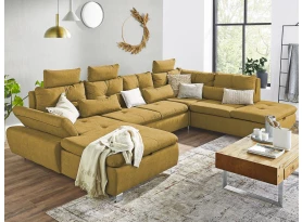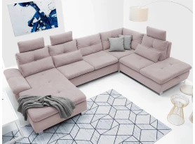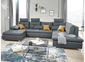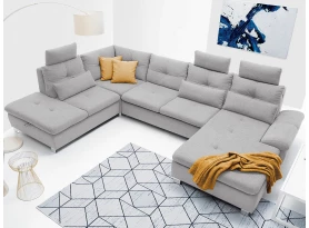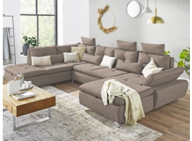 Priestranná trendová sedacia súprava s pôdorysom v tvare pravé U, obsahuje funkciu rozkladu na lôžko, dva rôzne úložné priestory, polohovateľnú podrúčku, vankúše aj tri opierky hlavy, ktoré môžete ľubovoľne umiestniť na akúkoľvek časť sedačky. Očalúnená príjemne mäkkou látkou v odtieni svetlo hnedá.