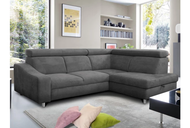 Moderná rohová sedacia súprava elegantných tvarov ponúkne komfort bez kompromisu aj v menšej obývacej izbe. Vysoké operadlo, nastaviteľné chrbtové opierky, úložný priestor aj funkcia rozkladu vám spríjemnia každodennú pohodu. Sedačka je očalúnená mäkkou štruktúrovanou látkou vo farbe stredne šedá. Variant sedačky s otomanom tvorí pravý roh.