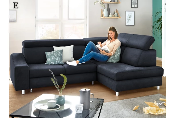 Moderná rohová sedacia súprava elegantných tvarov ponúkne komfort bez kompromisu aj v menšej obývacej izbe. Vysoké operadlo, nastaviteľné chrbtové opierky, úložný priestor aj funkcia rozkladu vám spríjemnia každodennú pohodu. Sedačka je očalúnená mäkkou štruktúrovanou látkou vo farbe temne modrá. Variant sedačky s otomanom tvorí pravý roh.
