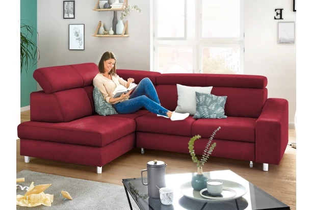 Moderná rohová sedacia súprava elegantných tvarov ponúkne komfort bez kompromisu aj v menšej obývacej izbe. Vysoké operadlo, nastaviteľné chrbtové opierky, úložný priestor aj funkcia rozkladu vám spríjemnia každodennú pohodu. Sedačka je očalúnená mäkkou štruktúrovanou látkou vo farbe šípkovo červená. Variant sedačky s otomanom tvorí ľavý roh.
