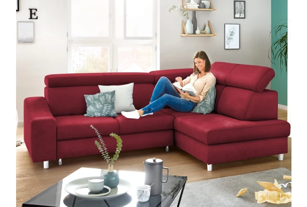 Moderná rohová sedacia súprava elegantných tvarov ponúkne komfort bez kompromisu aj v menšej obývacej izbe. Vysoké operadlo, nastaviteľné chrbtové opierky, úložný priestor aj funkcia rozkladu vám spríjemnia každodennú pohodu. Sedačka je očalúnená mäkkou štruktúrovanou látkou vo farbe šípkovo červená. Variant sedačky s otomanom tvorí pravý roh.