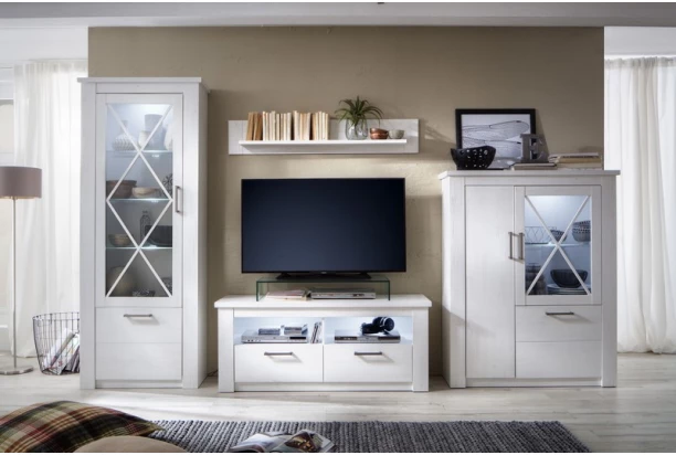 TV stolík z programu Georgia – nábytok z elegantného programu Georgia s okrasnými lištami zaujme svojím vidieckym nádychom. Dekor bielená pínia a optika širokých rámov pridáva na mohutnom vzhľade. Ideálne pre zariadenie interiéru vo vidieckom alebo rustikálnom štýle.
