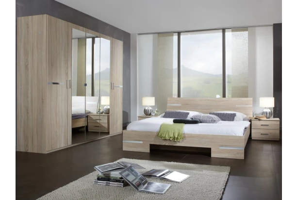 Zostava kompletnej spálne v drevodekóre dub sonoma s decentnými chrómovo lesklými aplikáciami pôsobí moderne. Spálňový set obsahuje posteľ s veľkosťou lôžka 180×200 cm, dva nočné stolíky so zásuvkami a šatníkovú skriňu, ktorej otočné dvere dopĺňajú praktické zrkadlá.