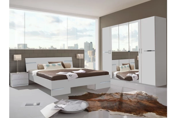 Zostava kompletnej spálne v bielom prevedení a s decentnými chrómovo lesklými aplikáciami pôsobí moderne. Spálňový set obsahuje posteľ o veľkosti lôžka 180×200 cm, dva nočné stolíky so zásuvkami a šatníkovú skriňu, ktorej otočné dvere dopĺňajú praktické zrkadlá.