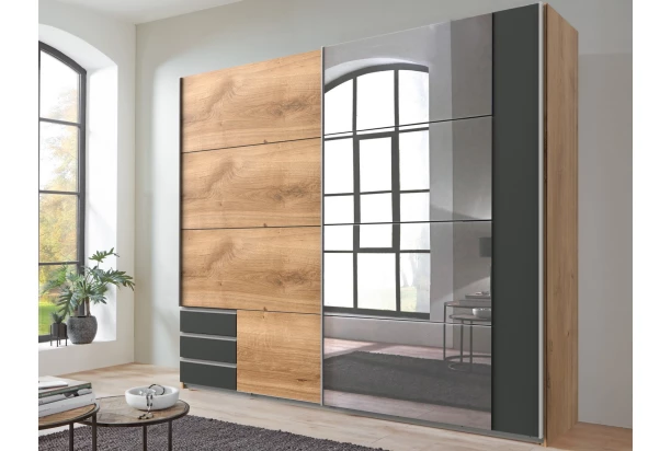 Šatníková skriňa v modernom dizajne osloví moderne založené osoby. Konštrukcia so šírkou 225 cm obsahuje 2 posuvné dvere, zrkadlo a 3 zásuvky. Vyrobená v kombinácii doskový dub/grafit.