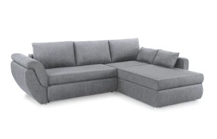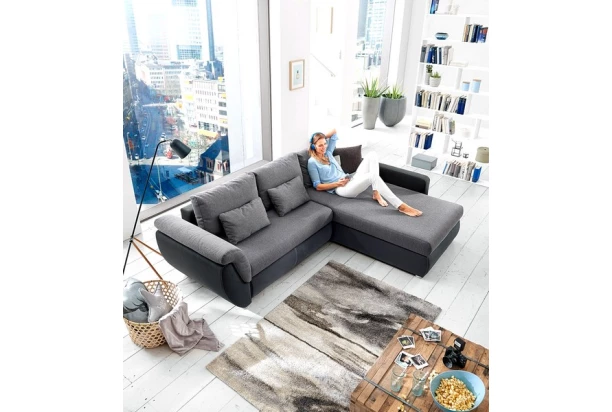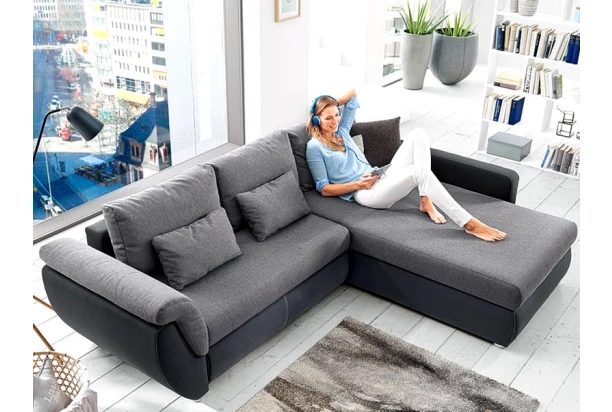 Zaoblená rohová sedacia súprava s príjemne mäkkými vankúšmi pre útulnú domácu pohodu. Vďaka funkcii rozkladu sa sedačka ľahko premení v lôžko pre príležitostné spanie. Otoman môžete univerzálne zmontovať na pravú alebo ľavú stranu – nájde tak ľahko miesto v akejkoľvek miestnosti. V kombinácii čierna / sivá tkanina.