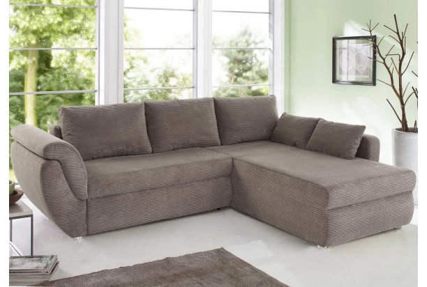 Zaoblená rohová sedacia súprava s príjemne mäkkými vankúšmi pre útulnú domácu pohodu. Vďaka funkcii rozkladu sa sedačka ľahko premení na lôžko pre príležitostné spanie. Otoman môžete univerzálne zmontovať na pravú alebo ľavú stranu – nájde tak ľahko miesto v akejkoľvek miestnosti. Očalúnená mäkkou štruktúrovanou látkou v odtieni šedo-hnedá taupe.
