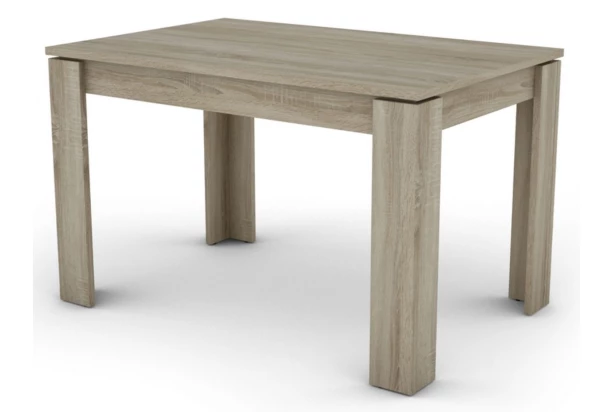 Trendový jedálenský stôl o rozmere 120×80 cm v dekore dub sonoma má kvalitnú pevnú konštrukciu so širokými rohovými nohami.