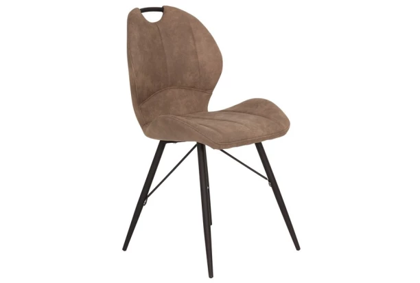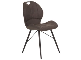 Dizajnová jedálenská stolička na čiernej kovovej podnoži má tvarované operadlo pre pohodlnú oporu. Stolička je očalúnená látkou vo vintage optike hnedej brúsenej kože.