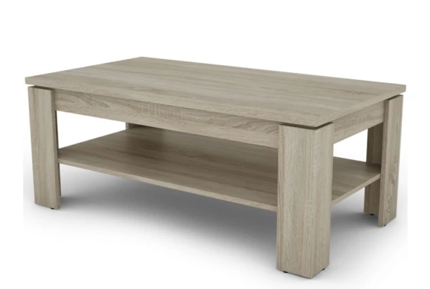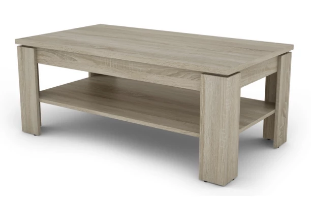 Trendový konferenčný stolík o rozmere 110×60 cm v dekore dub sonoma má kvalitnú pevnú konštrukciu so širokými rohovými nohami a dolnú odkladaciu priehradku.