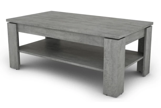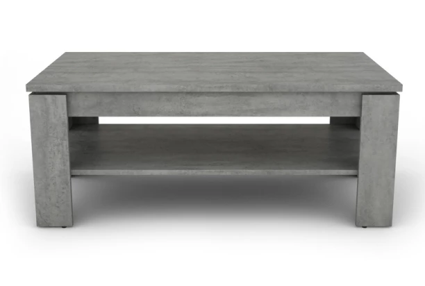 Trendový konferenčný stolík o rozmere 110×60 cm v imitácii sivý betón má kvalitnú pevnú konštrukciu so širokými rohovými nohami a dolnú odkladaciu priehradku.
