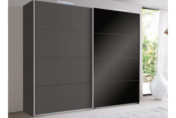 Šatník o šírke 225 cm a s 2 posuvnými dverami zo série Easy Plus. Skriňa vhodná do akejkoľvek modernej spálne, šatne alebo chodby. V kombinácii grafitovej farby a čierneho skla pôsobí luxusne.