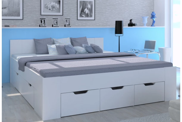 Jednoducho tvarovaná posteľ v bielom prevedení a o rozmere lôžka 180×200 cm je navrhnutá tak, aby sa rozmerovo zmestila aj do malej spálne a zároveň ponúkla praktické úložné priestory v podobe bočných výsuvných zásuviek, kam ľahko uschováte potrebnú posteľnú bielizeň alebo oblečenie.