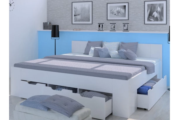 Jednoducho tvarovaná posteľ v bielom prevedení a o rozmere lôžka 160×200 cm je navrhnutá tak, aby sa rozmerovo zmestila aj do malej spálne a zároveň ponúkla praktické úložné priestory v podobe bočných výsuvných zásuviek, kam ľahko uschováte potrebnú posteľnú bielizeň alebo oblečenie.