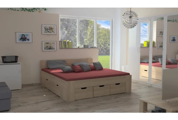 Jednoducho tvarovaná posteľ v dekore dub sonoma a o rozmere lôžka 140×200 cm je navrhnutá tak, aby sa rozmerovo zmestila aj do malej spálne a zároveň ponúkla praktické úložné priestory v podobe bočných výsuvných zásuviek, kam ľahko uschováte potrebnú posteľnú bielizeň alebo oblečenie.