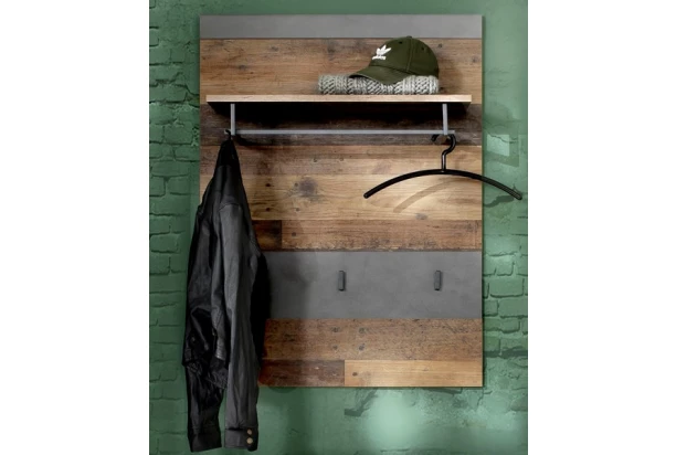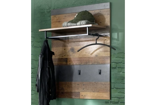 Predsieňový vešiakový panel v industriálnom štýle upúta pozornosť už na pohľad skvelou vintage optikou drevených lát a brúseného kovu. Nábytok tak dokonale podčiarkne osobitosť vášho interiéru. Obsahuje policu a šatníkovú tyč aj závesné háčiky.