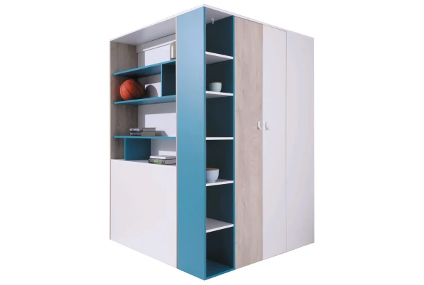 Kombinovaná rohová šatníková skriňa z programu Planet – kombinácia svetlého dubového dekoru, bielej a morskéj modrej farby vyzerá zaujímavo. Nábytok je tak ideálny pre zariadenie detskej alebo študentskej izby, prípadne i dospelých. Obsahuje praktické členité vnútorné priestory s osvetlením i vonkajší odkladací regál.