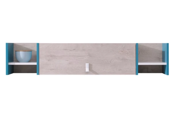 Malá nástenná skrinka s policami z programu Planet – kombinácia svetlého dubového dekoru, bielej a morskej modrej farby vyzerá zaujímavo. Nábytok je tak ideálny pre zariadenie detskej alebo študentskej izby, prípadne i dospelých.