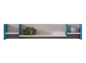 Nástavný regál z programu Planet – kombinácia svetlého dubového dekoru, bielej a morskej modrej farby vyzerá zaujímavo. Nábytok je tak ideálny pre zariadenie detskej alebo študentskej izby, prípadne i dospelých.