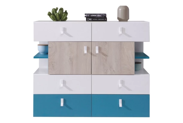 Komoda z programu Planet – kombinácia svetlého dubového dekoru, bielej a morskej modrej farby vyzerá zaujímavo. Nábytok je tak ideálny pre zariadenie detskej alebo študentskej izby, prípadne i dospelých.