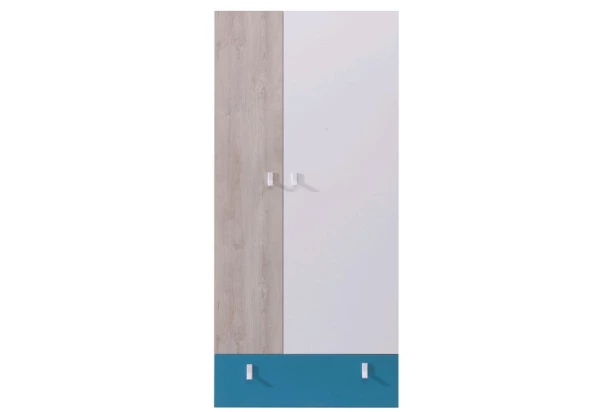 Šatníková skriňa z programu Planet – kombinácia svetlého dubového dekoru, bielej a morské modrej farby vyzerá zaujímavo. Nábytok je tak ideálny pre zariadenie detskej alebo študentskej izby, prípadne i dospelých.