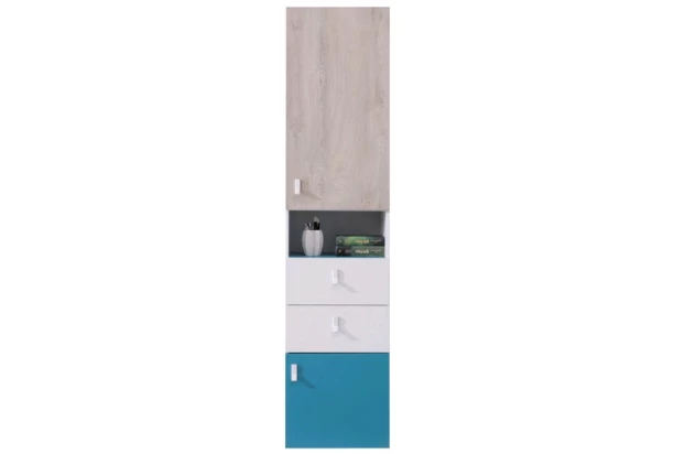 Vysoký úložný regál/skrinka z programu Planet – kombinácia svetlého dubového dekoru, bielej a morskej modrej farby vyzerá zaujímavo. Nábytok je tak ideálny pre zariadenie detskej alebo študentskej izby, prípadne i dospelých.