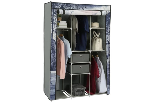 - vnútorný priestor: úložný priestor, 9× šedá látková polica, 2× horná závesná kovová tyč (odporúčaná nosnosť cca do 6 kg), 2× vyberateľná látková zásuvka