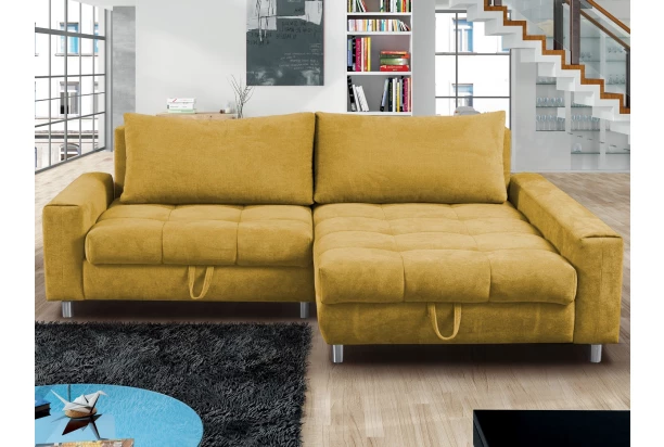 Rohová sedacia súprava Kevin je ideálna aj do malého priestoru. Aj napriek svojej veľkosti ponúka kvalitný komfort, veľký otoman pre pohodovú relaxáciu, úložný priestor aj praktickú funkciu rozkladu na veľmi priestranné lôžko pre dve dospelé osoby, ktoré možno využiť aj na trvalé spanie. Očalúnená mäkkou štruktúrovanou látkou vo farbe žltá karí. Sedačka tvorí pravý roh.