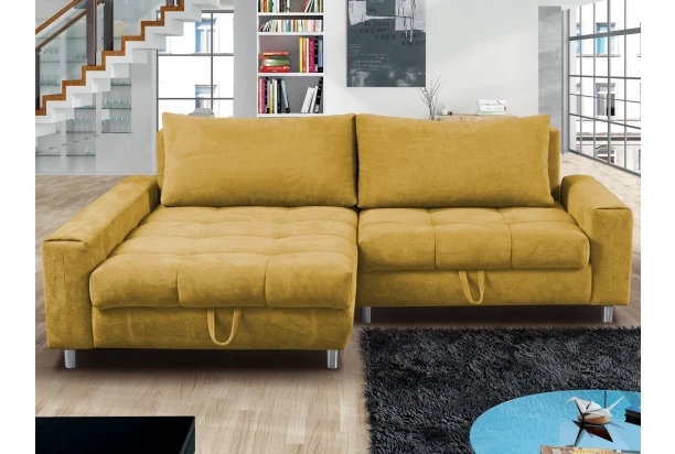 Rohová sedacia súprava Kevin je ideálna aj do malého priestoru. Aj napriek svojej veľkosti ponúka kvalitný komfort, veľký otoman pre pohodovú relaxáciu, úložný priestor aj praktickú funkciu rozkladu na veľmi priestranné lôžko pre dve dospelé osoby, ktoré možno využiť aj na trvalé spanie. Očalúnená mäkkou štruktúrovanou látkou vo farbe žltá karí. Sedačka tvorí ľavý roh.