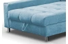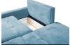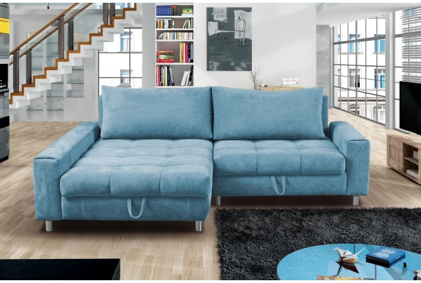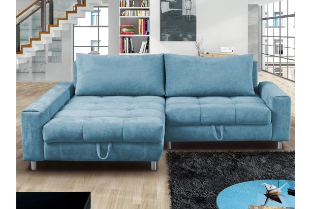Rohová sedacia súprava Kevin je ideálna aj do malého priestoru. Aj napriek svojej veľkosti ponúka kvalitný komfort, veľký otoman pre pohodovú relaxáciu, úložný priestor aj praktickú funkciu rozkladu na veľmi priestranné lôžko pre dve dospelé osoby, ktoré možno využiť aj na trvalé spanie. Očalúnená mäkkou štruktúrovanou látkou vo farbe azúrovo modrá. Sedačka tvorí ľavý roh.