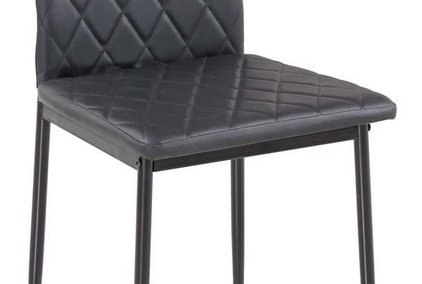 Kovová jedálenská stolička má sedaciu časť očalúnenú čiernou ekokožou, ktorá je naviac ozvláštnená okrasným kosoštvorcovým prešitím.