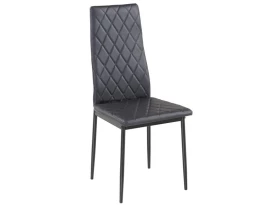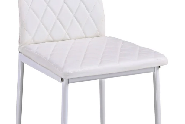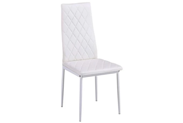 Kovová jedálenská stolička má sedaciu časť očalúnenú bielou ekokožou, ktorá je naviac ozvláštnená okrasným kosoštvorcovým prešitím.