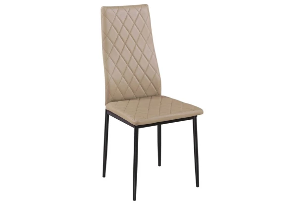 Kovová jedálenská stolička má sedaciu časť očalúnenú béžovou ekokožou, ktorá je naviac ozvláštnená okrasným kosoštvorcovým prešitím.