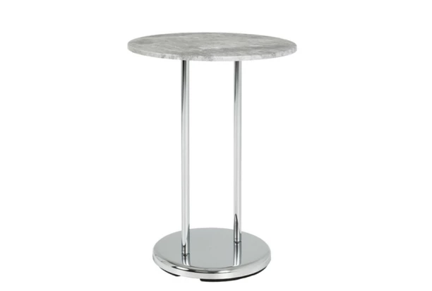 Praktický guľatý odkladací stolík v imitácii sivého betónu je na kovovej podnoži v lesklo chrómovom prevedení.
