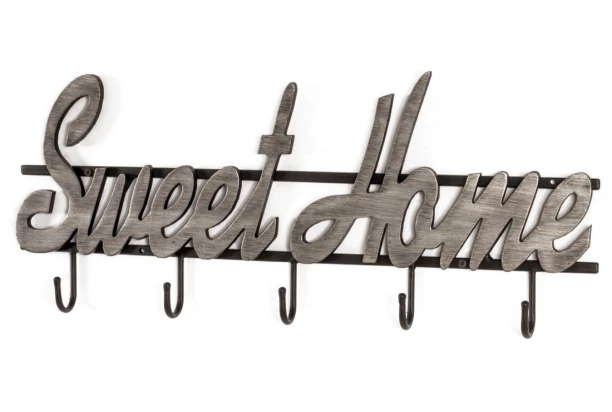 Kovový nástenný vešiak s nápisom Sweet Home s háčikmi pre jednoduché zavesenie ošatenia, tašiek alebo kľúčov. Čierne povrchy dopĺňa štýlový vintage efekt brúseného kovu.