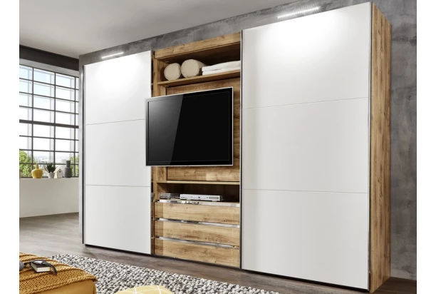 Skvelá a nápaditá šatníková skriňa s posuvnými dverami a stredovým panelom pre zavesenie TV, za ktorým je naviac ukrytý ďalší úložný priestor. V modernej spálni či obývačke tak môžete mať spolu na jednom mieste umiestnenú ako televíziu, tak úložné priestory.